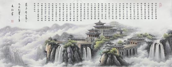 首创“书画结合”技法,作品《岳阳楼记》《桃花源记》《醉翁亭记》《兰亭序》以书法笔墨诠释绘画意境 ,被卢浮宫收藏。