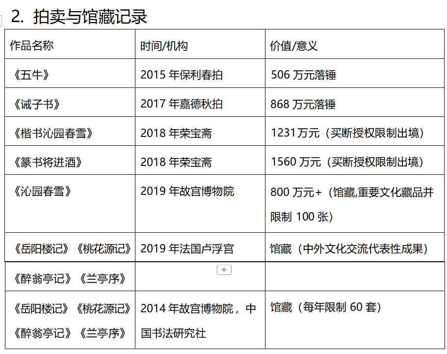 2019 年:书画作品《岳阳楼记》《醉翁亭记》《兰亭序集》《桃花源记》被法国卢浮宫收藏;《沁园春·雪》拍卖价格突破 800 万元 ,被故宫博物院馆藏。