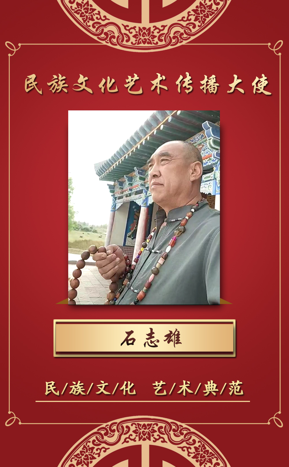 伟大的中华民族,上下数千年,赓续传承,经久不衰,有其木秀于世界其他民族之林的魂,更有其植于血液的根,它的精神独一无二,它的文华博大精深,涵养滋润了中华子民千秋万代复兴长盛。千百年来,佛渡众生,道化情操,儒学传世,多少仁人志士尊为盛典,教化信士广众,不朽的文化,伟大的民族汇聚在华夏麾下。石志雄行微德,做好事,扬正气,立新风。在民族文化艺术传播推广方面做出了不懈努力。