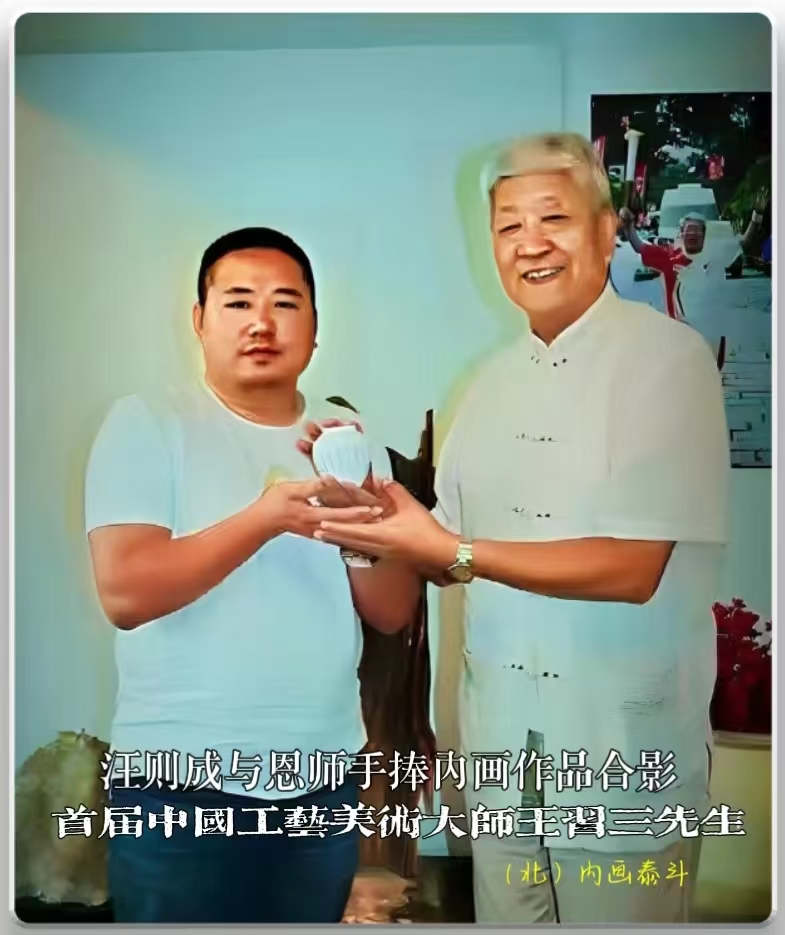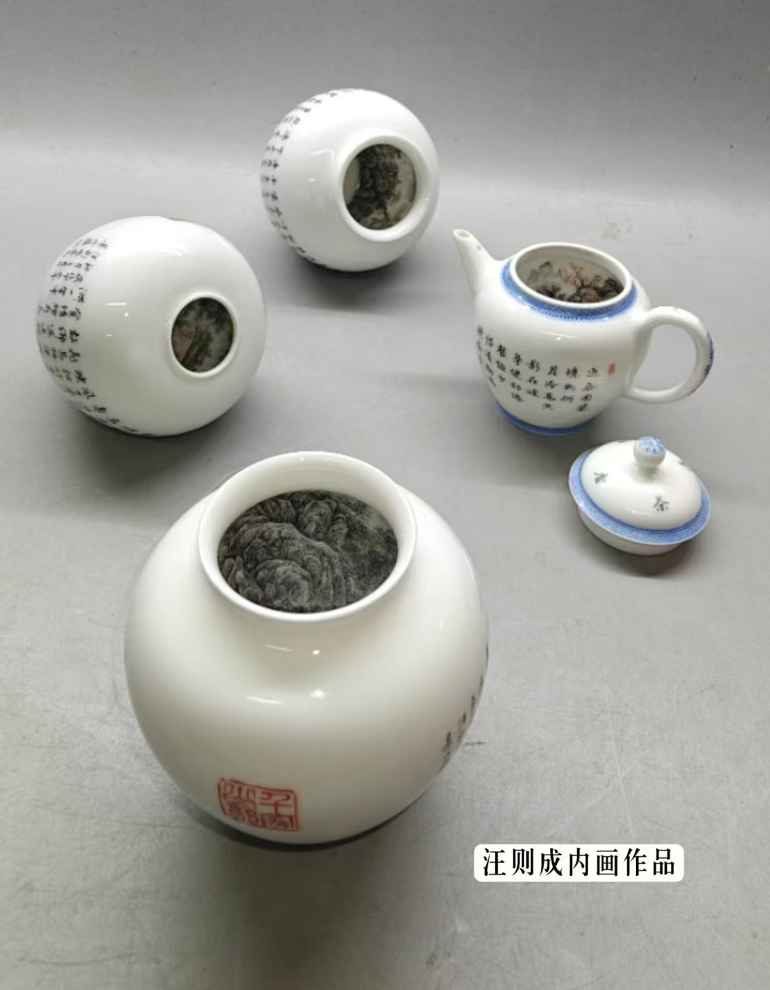 汪则成看鼻烟壶内画,却以此为窗口,顿悟了可以用内画方式创建审美新宇宙的精髓,艺术感性帮助了他,成就了他,也成就了白瓷内画这一门亘古未有的美学精彩!汪则成以白瓷器物内壁为创作基底,不但大大拓展了内画载体范围,并且丰富了内画艺术语言,或摩刻,或勾勒,或渲染,或山水,或花鸟,或人物!题材丰富多彩,技法精益求精,在白瓷器物内壁上画出了万里江山,画出了和谐盛世!你可以想象,在鼻烟壶内壁作画,在较小的空间里是不允许有丝毫差池的,那已经是难于上青天的丹青塑造。