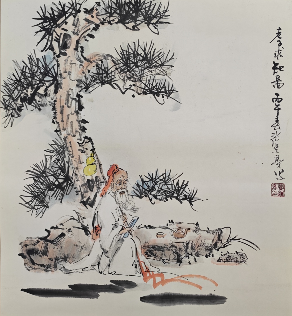 《老子求知图》以传统水墨为载体,将道家始祖老子的形象与松风石案的清雅意境融为一体。画面中,苍松虬劲,松针如墨,树下老子身着素衣,长髯飘逸,手持书卷凝神静思,石案上茶烟袅袅,葫芦悬于松枝,尽显“道法自然”的恬淡与通透。张运亭先生以简练洒脱的线条、温润雅致的设色,将老子求知向道的精神内核与中国传统文人画的诗意表达完美结合,既传承了宋元以来的文人画脉络,又融入了当代审美意趣,展现出深厚的艺术功底与文化底蕴。