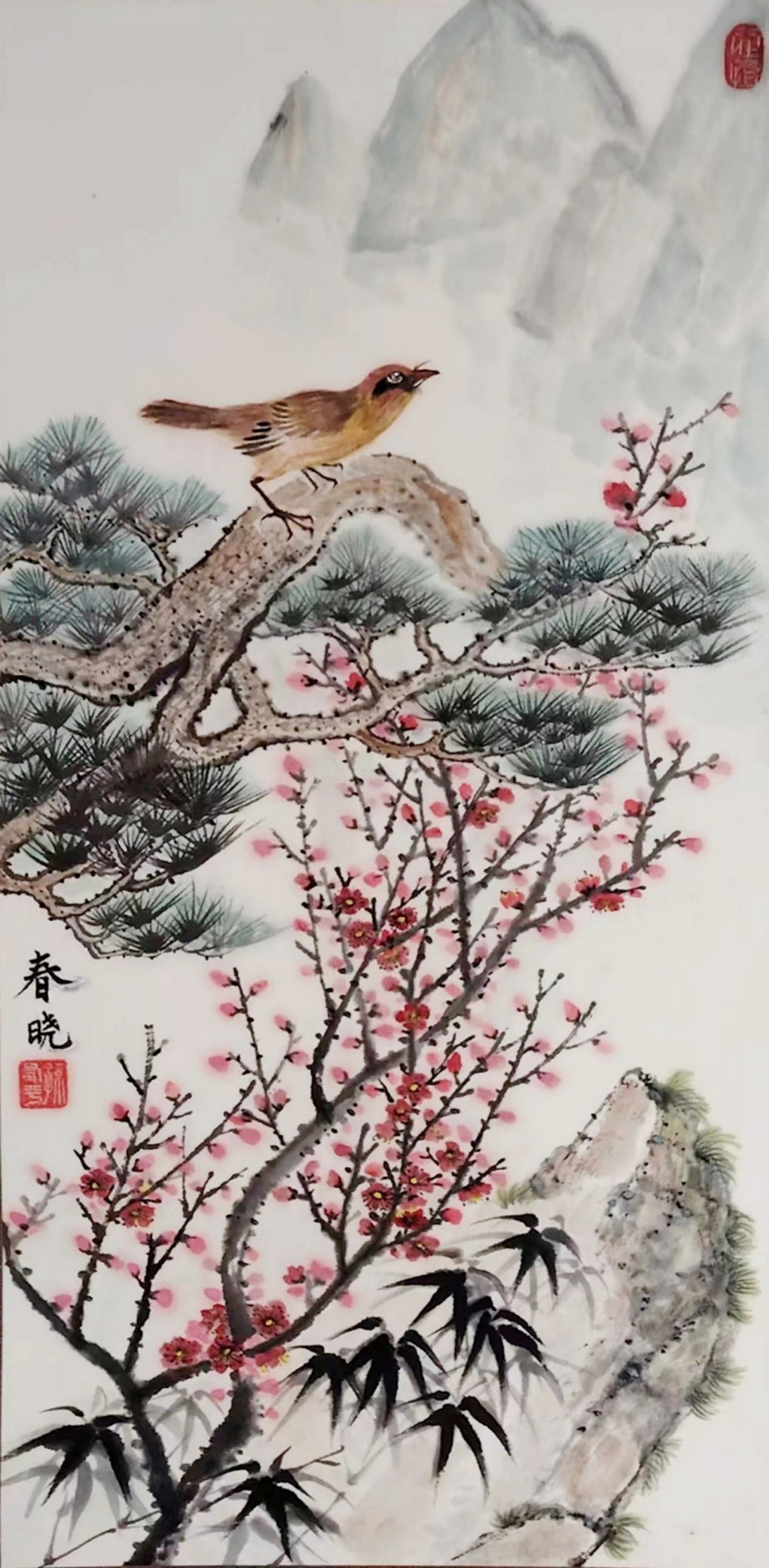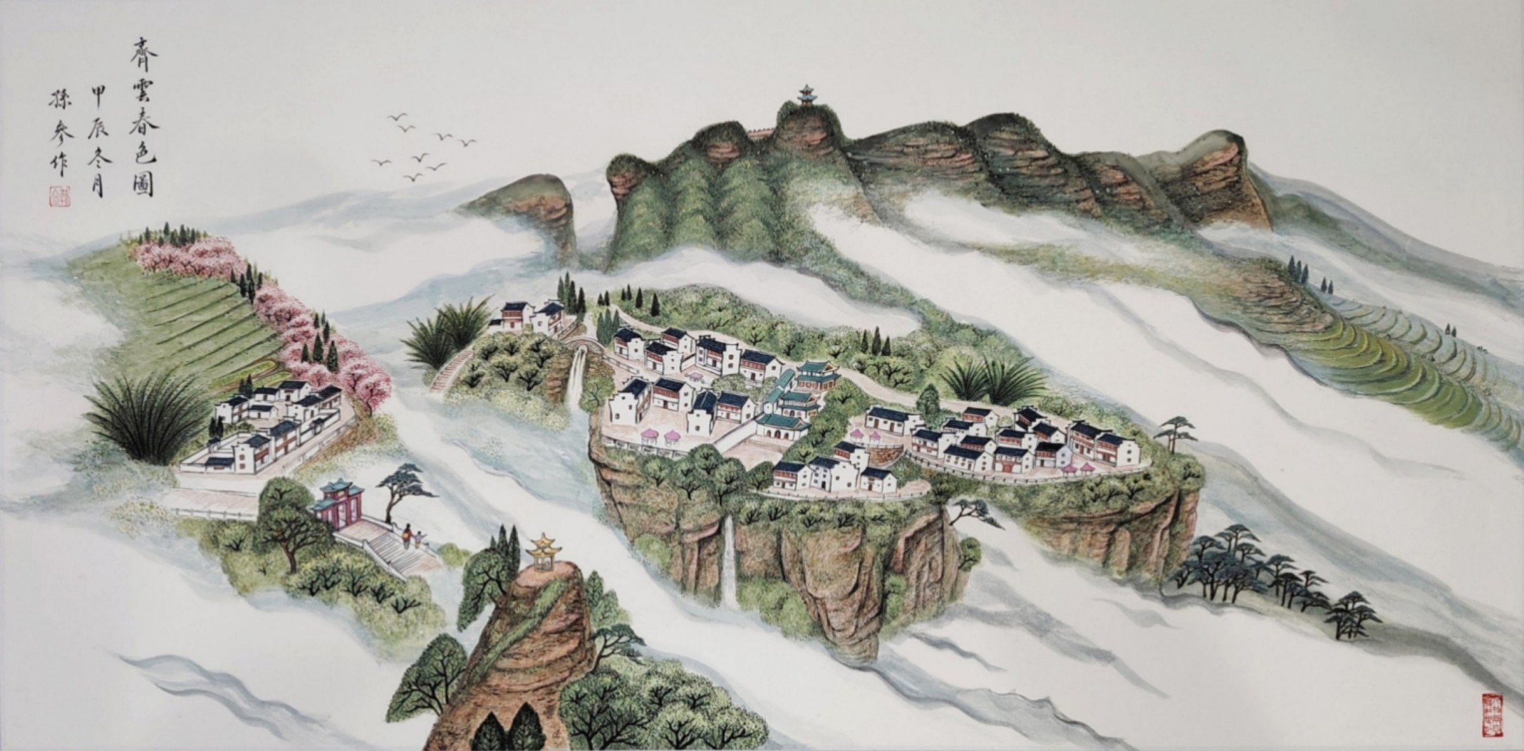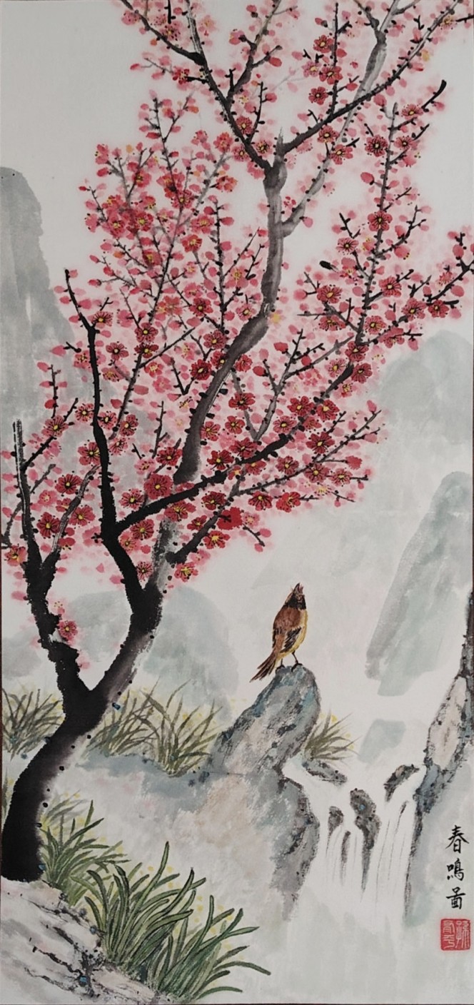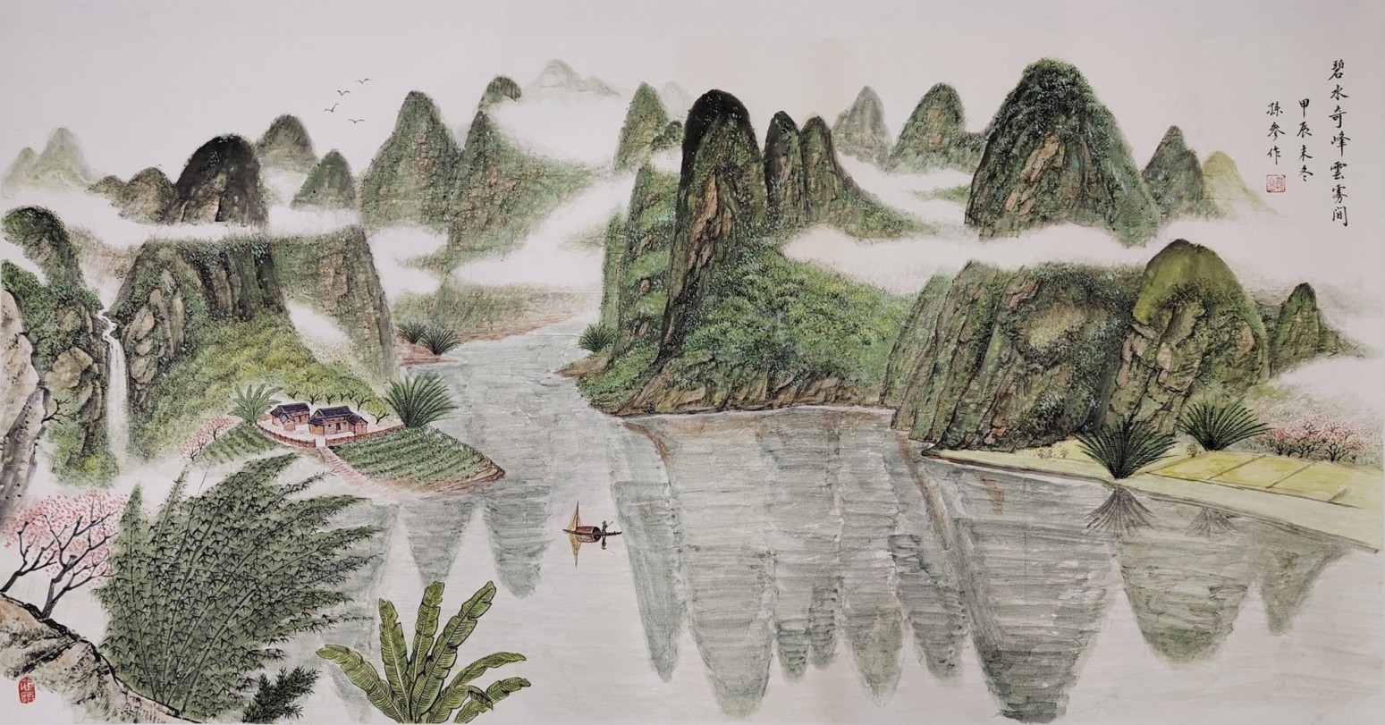 这种创新,并非对传统的颠覆,而是在继承基础上的升华。孙参的笔墨线条兼具骨力与韵致,设色清雅明丽却不艳俗,既保留了中国画 “以线造型、以墨传神” 的核心特质,又以写实的表现手法赋予画面强烈的现场感与感染力。《齐云秀色图》中丹霞地貌的红褐肌理与云雾间的白墙村落相映成趣,《碧水奇峰云雾间》里漓江山水的倒影如镜、渔舟轻泛,《春鸣图》中红梅绽放、雀鸣泉涧的生机盎然,每一幅作品都跳出了传统山水画的写意窠臼,以 “现实主义” 的视角,还原自然山水的真实风貌,更传递出人与自然和谐共生的东方哲思。这种 “新现实主义” 的探索,让山水画不再只是文人逸趣的载体,更成为记录时代风貌、承载人文情怀的艺术表达,在中国当代山水画发展中具有开创性的意义。