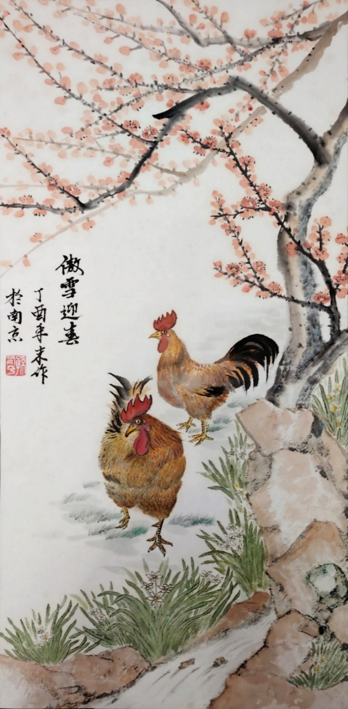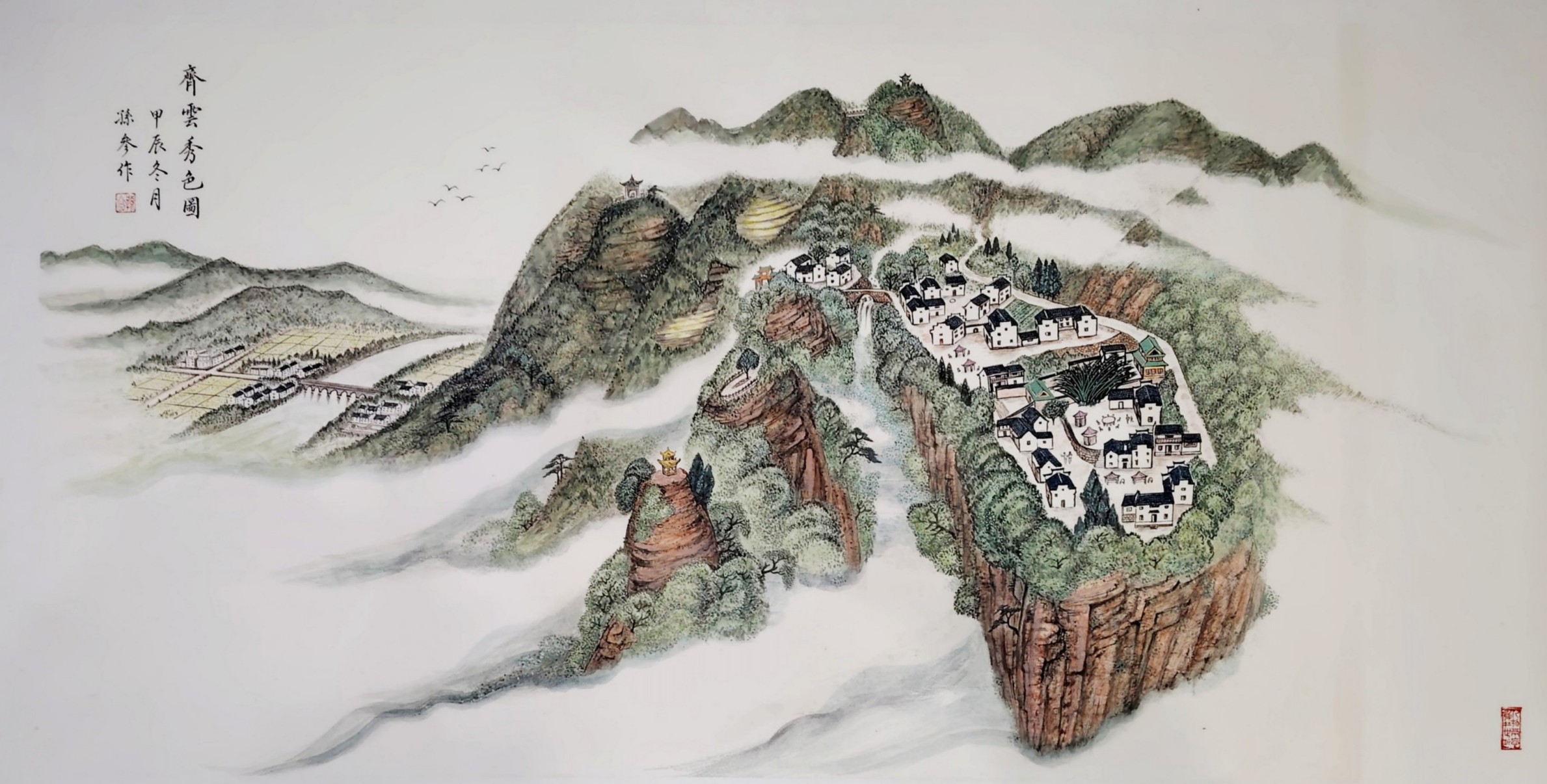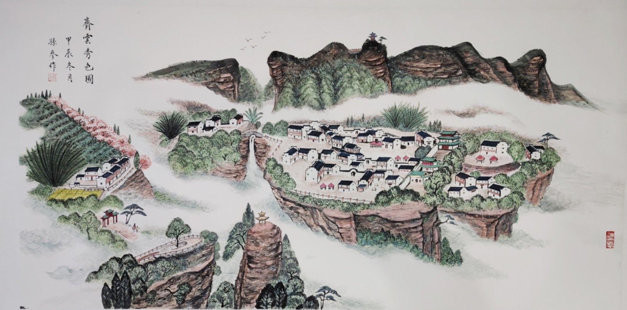 这种创新,并非对传统的颠覆,而是在继承基础上的升华。孙参的笔墨线条兼具骨力与韵致,设色清雅明丽却不艳俗,既保留了中国画 “以线造型、以墨传神” 的核心特质,又以写实的表现手法赋予画面强烈的现场感与感染力。《齐云秀色图》中丹霞地貌的红褐肌理与云雾间的白墙村落相映成趣,《碧水奇峰云雾间》里漓江山水的倒影如镜、渔舟轻泛,《春鸣图》中红梅绽放、雀鸣泉涧的生机盎然,每一幅作品都跳出了传统山水画的写意窠臼,以 “现实主义” 的视角,还原自然山水的真实风貌,更传递出人与自然和谐共生的东方哲思。这种 “新现实主义” 的探索,让山水画不再只是文人逸趣的载体,更成为记录时代风貌、承载人文情怀的艺术表达,在中国当代山水画发展中具有开创性的意义。