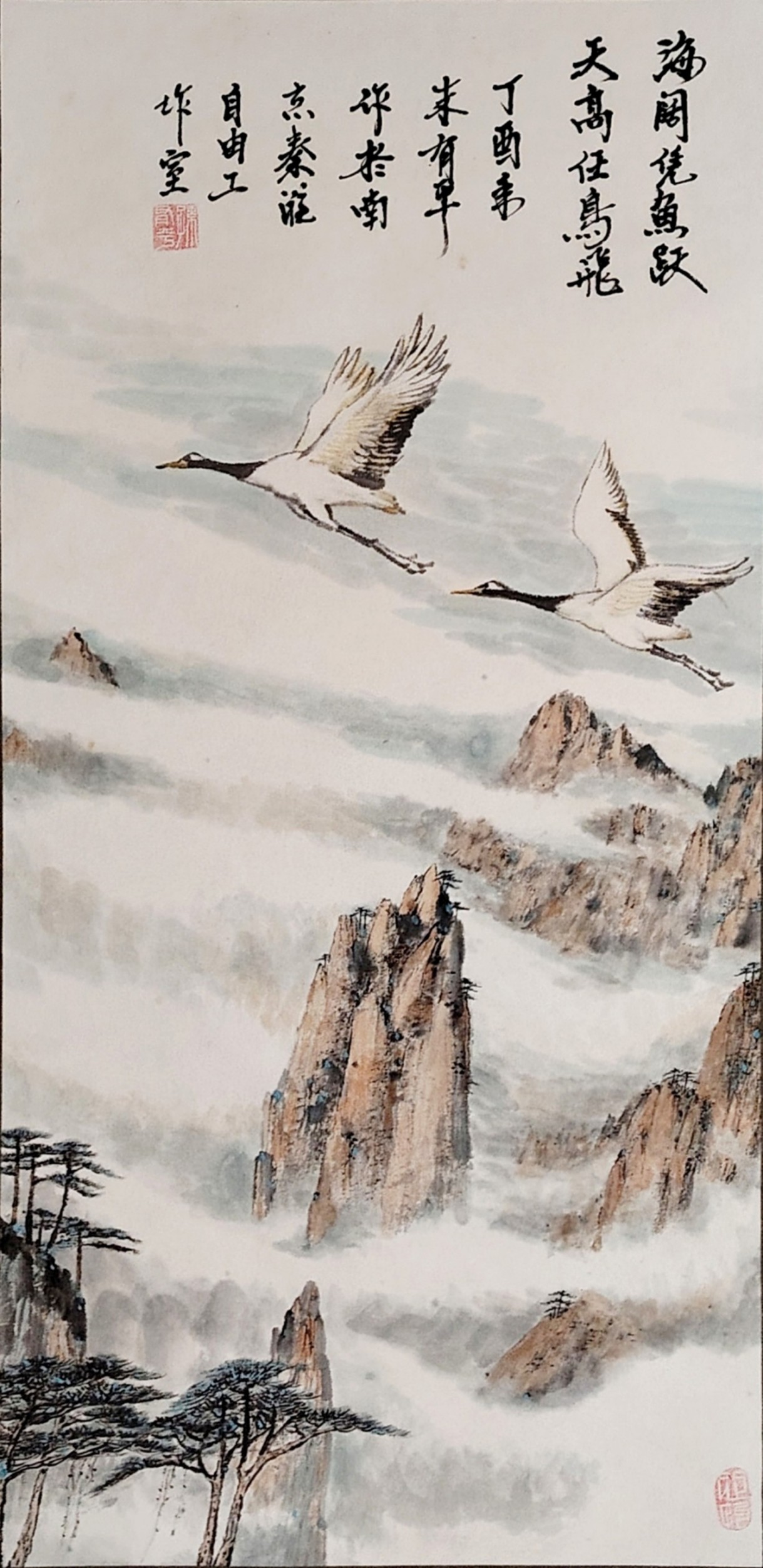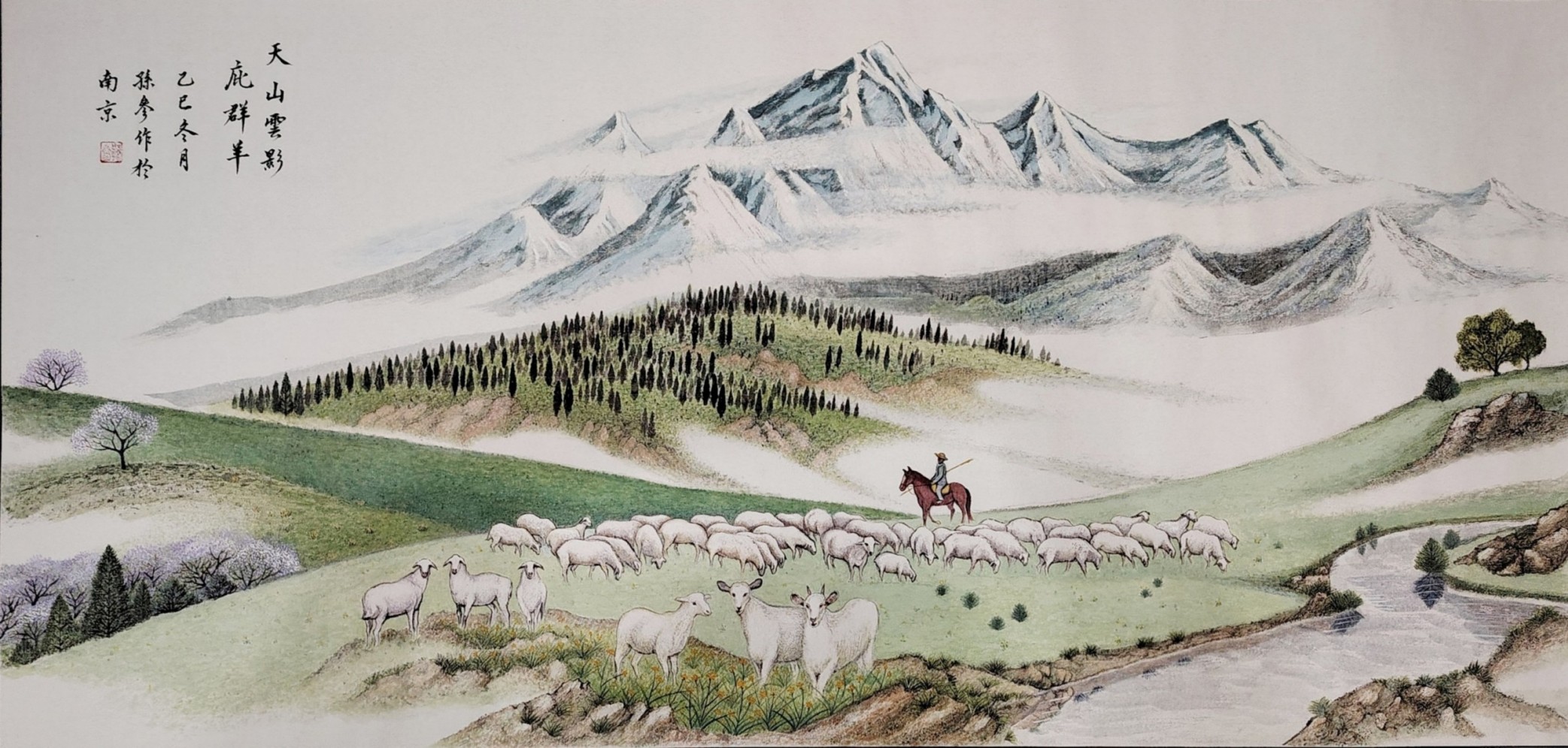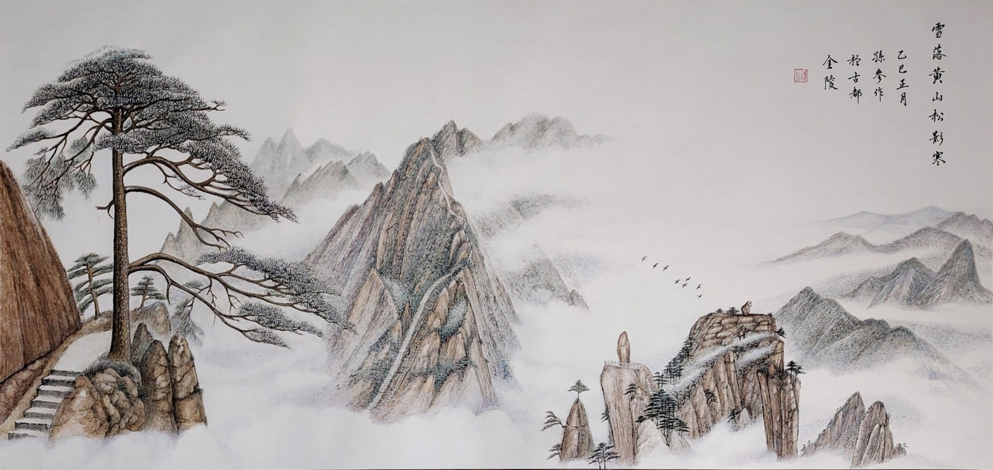 孙参的艺术创作,扎根于对传统中国画精髓的深刻传承,更始终保持着突破与创新的自觉。他的作品打破了传统山水画程式化的表达,在构图、色彩与表现手法上巧妙融合西方绘画的现代理念,让笔墨意趣兼具时代质感。无论是《雪域高原赛江南》中雪山映湖、天鹅栖荷的雪域江南盛景,还是《溪行沐春图》里白墙黛瓦、渔舟唱晚的水乡春日,亦或是《黄岳奇伟 云海幽》中迎客松探云、奇峰入画的黄山云海,都以细腻的笔触、鲜活的细节,将自然山水的灵秀与人文意趣融为一体,实现了传统笔墨意境与现代审美视角的完美契合。