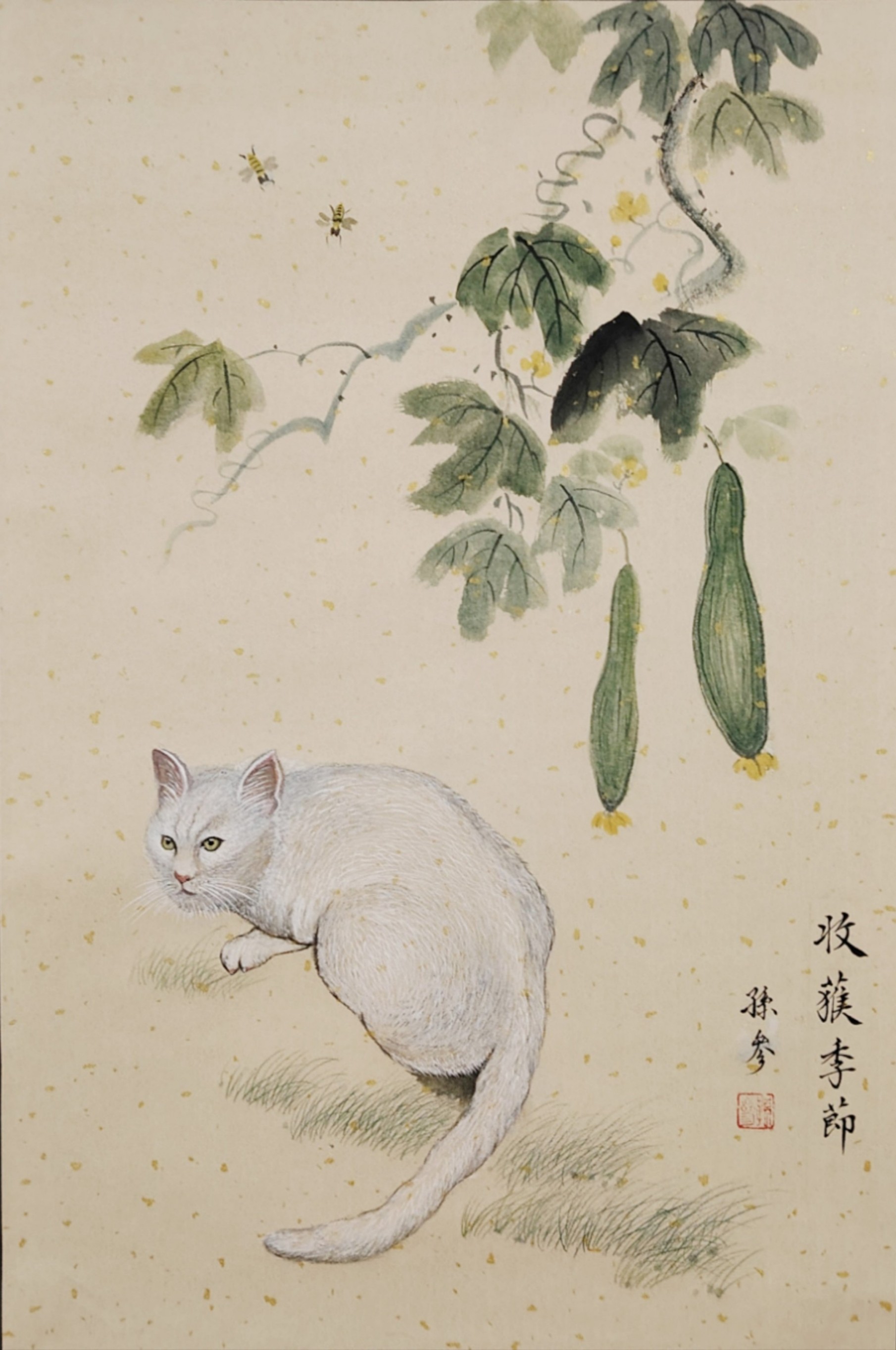 从艺术价值来看,孙参的作品兼具笔墨的传统意趣与鲜明的个人风格,每一笔都凝聚着数十年的创作积淀。《高风亮节荷塘清》中泼墨写意的荷花苍劲洒脱,《收获季节》里工笔细腻的白猫与丝瓜鲜活灵动,展现了他兼工带写、亦精亦放的多元表现力。他的作品多次斩获国家级赛事奖项:《雪域高原赛江南》获 “2024 神州颂诗书画艺术年赛” 国展一等奖,《溪行沐春图》获 “2025 右军杯全国诗书画家作品邀请赛” 国展一等奖,更在中越建交 75 周年书画展、佛罗伦萨美术学院中外交流展中斩获重要荣誉,作品被权威机构收藏,广泛收录于《新中国 75 周年文艺名家大辞典》《中国年度文艺家代表作文库》等专业典籍,获得业界与市场的双重认可。