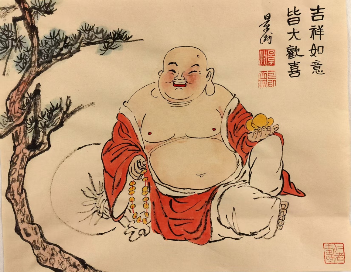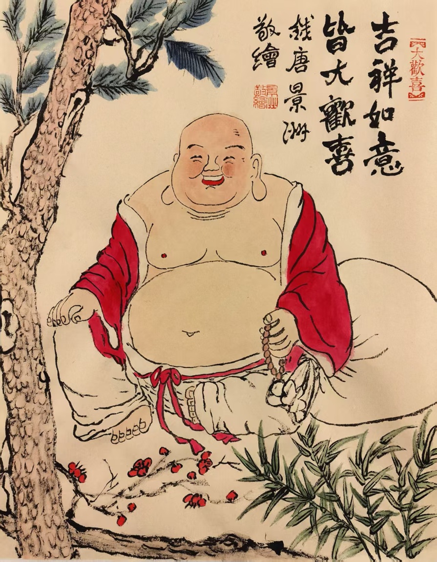 《布袋和尚》是景洲的标志性作品之一。画面中,布袋和尚袒胸露腹、憨态可掬,以简练的线条勾勒出人物轮廓,墨色浓淡相宜,衣褶随风而动,背景留白处以淡墨晕染,营造出空灵悠远的禅意氛围。此作既传承了梁楷、闵贞等古代画家“减笔写意”的技法,又融入现代审美对人物神态的捕捉,体现了景洲对传统与现代的融合创新。