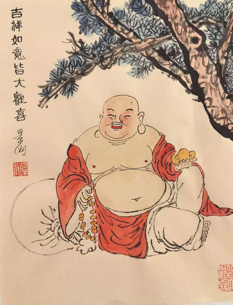师承著名人物画家方増先、吴山明、丁茂鲁,深受其艺术熏陶,逐渐形成了自己独特的艺术风格。他的作品线条老辣,笔墨灵动,弥勒佛形象栩栩如生,深入研习明清以来写意人物画的精髓,尤以徐渭、八大山人等大师为宗,逐渐形成“笔墨灵动、形神兼备”的个人风格,呈现出一种全新的佛教文化,既有传统写意画的韵味,又融入了现代审美元素。