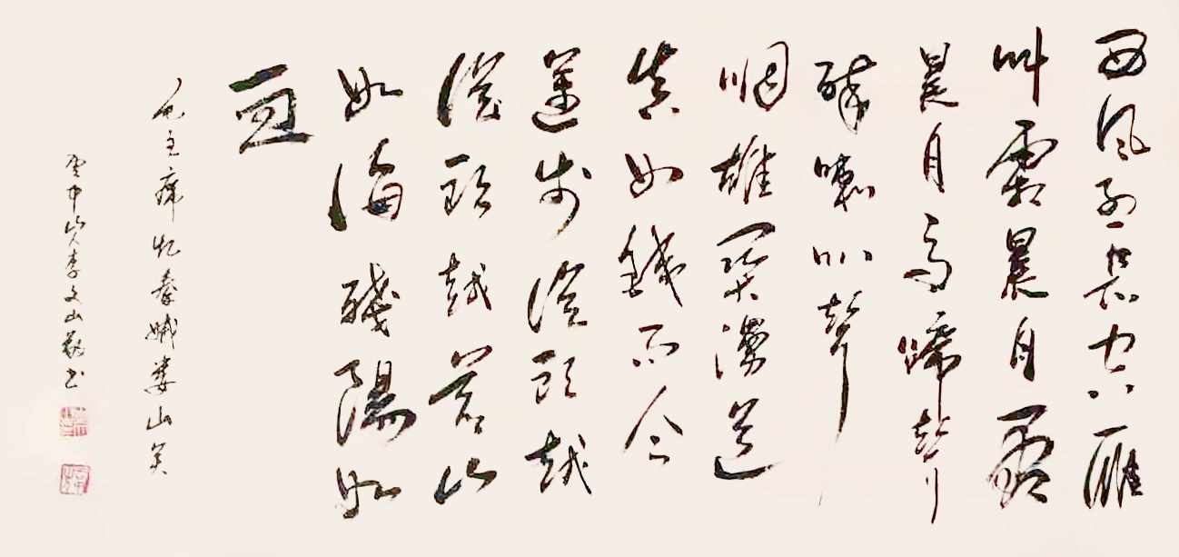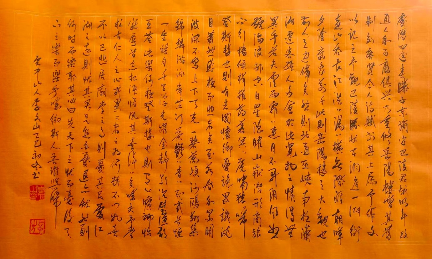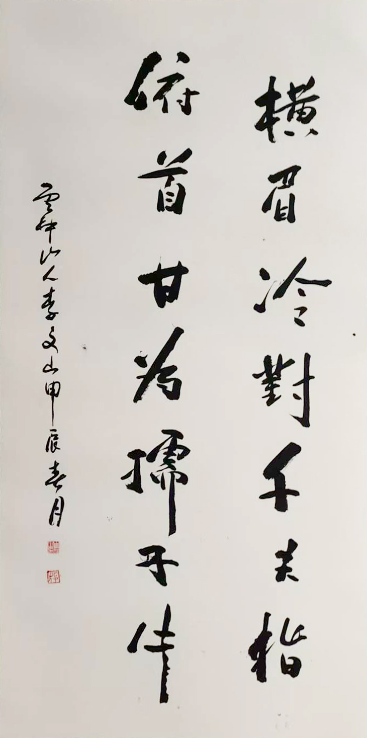 1978年,李文山先生投身教育事业,担任初中教师十三年。教学之余,他常为教学刻写蜡板,借此契机潜心习练仿宋体,日复一日,对仿宋体的笔画、结构、韵律烂熟于心。一次偶然的尝试中,他将仿宋体的规整严谨与毛笔的灵动气韵相结合,打破传统字体边界,成功将仿宋体笔法迁移至毛笔书写,创造出一种兼具印刷字体规范与书法艺术韵味的新字体,至今尚未命名,成为其书法艺术的鲜明标识。