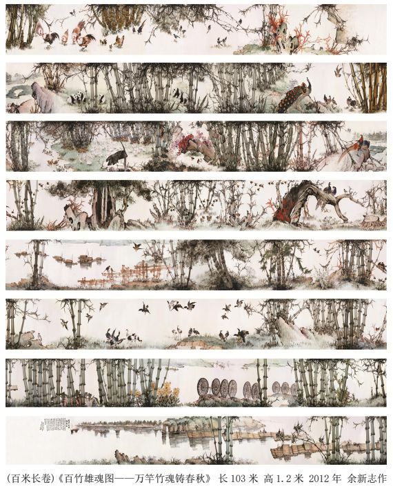 余老先生几十年来,走遍大江南北,全身心投入竹画写生创作,收集素材数千幅,终于在 2012 年创作完成了长 103 米、宽 1.2 米的百米长卷《百竹雄魂图——万竿竹魂铸春秋》,创下“画竹种类最多、最美的百米长卷”世界纪录,传承千秋。2016年百米长卷又被载入《中国国史》,为世人留下了不朽的竹画史料、宝贵财富,永载史册。从 1993 年以来,中国邮政总局先后为余新志先生出版珍藏纪念邮票三十余套,全球发行,传播文化。并先后出版发行余新志个人专著画集数百套。上百幅作品被国家博物馆、中国美术馆等国内外几百家艺术藏馆永久收藏陈列。其个人传略被载入《中国人物年鉴》《中国国史》《中国历代美术家名人大辞典》《世界人物辞海》等百余部辞书。余新志先生倾尽毕生心血,为弘扬中华民族优秀的传统文化作出了杰出贡献。