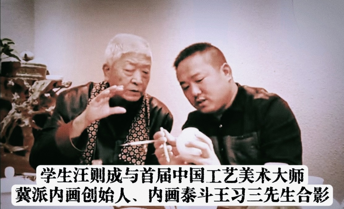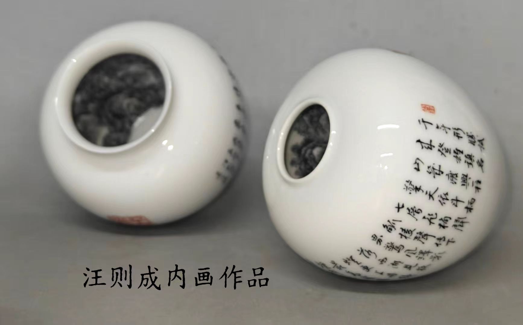 汪则成看鼻烟壶内画,却以此为窗口,顿悟了可以用内画方式创建审美新宇宙的精髓,艺术感性帮助了他,成就了他,也成就了白瓷内画这一门亘古未有的美学精彩!汪则成以白瓷器物内壁为创作基底,不但大大拓展了内画载体范围,并且丰富了内画艺术语言,或摩刻,或勾勒,或渲染,或山水,或花鸟,或人物!题材丰富多彩,技法精益求精,在白瓷器物内壁上画出了万里江山,画出了和谐盛世!你可以想象,在鼻烟壶内壁作画,在较小的空间里是不允许有丝毫差池的,那已经是难于上青天的丹青塑造。