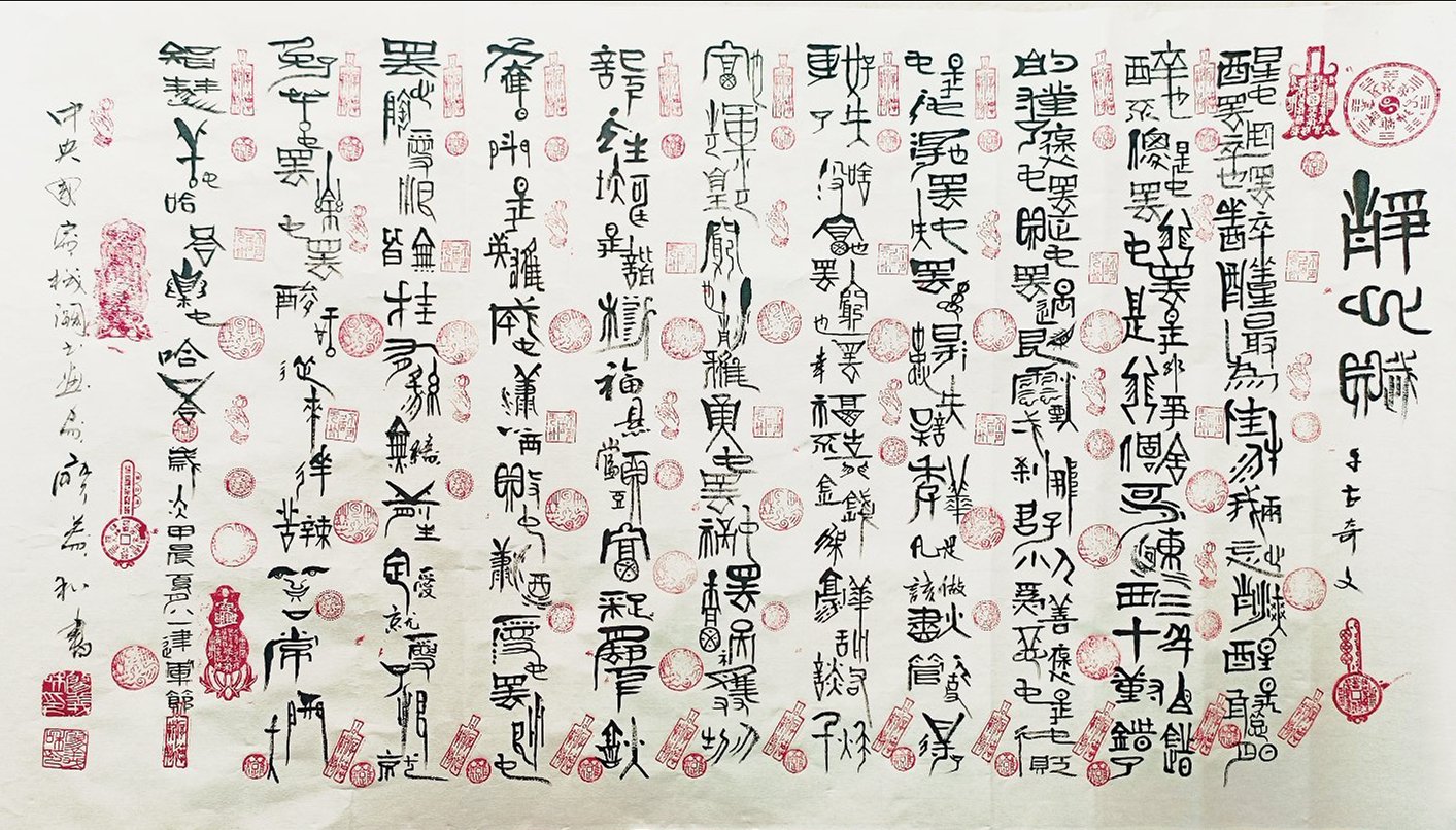 廖义和老师综合各家所长,打破传统很多观念,创造了独具一格的书法审美视觉,形成了天浮、地坐、等式、多边、圆形、长方、正方等字体书法形体体系,行体贯通,让字与字之间妙笔生辉,意蕴无.所以廖老师的字,既无先代大家的形貌,也无先代大家的不羁,更多的是追求中国字形体的美以及对生活的思考。廖义和老师的字,体现了他一生的成长:年轻时的憧憬,青年时的挫折,中年时的奔波,都在字间流露无遗,就象汉字在演练五千年中国文化一样。