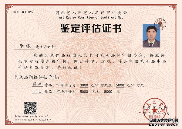 李振,男,1977年6月28日出生在山东省菏泽市曹县赵楼行政村。自幼喜欢画画,7~12岁在赵楼行政村读小学,13-17岁在曹城镇姜楼中学就读中学期间参加全县中学生绘画比赛荣获一等奖。18岁参军在浙江省杭州市一军一师三团,在部队期间深受浙江岭南画派影响自学芥子园图谱,田世光,金鸿钧等画家绘画风格。每年部队八一军人文化会画展都有作品获奖。在部队期间1997年由于我们部队担任东南沿海战区国家战备值班部队,肩负着收复香港的历史使命。刻苦训练荣获个人优秀士兵嘉奖。1997年4月清明节期间参加杭州富阳市山林救火。5月份梅雨季节参加富阳市富春江灵桥镇段决堤抗洪救灾。12月份杭州暴雪参加清理钱塘江大桥交通清雪任务,1998年7月部队接到中央军委命令参加江西省九江市浔阳区长江抗洪抢险任务。在历史上从未有过的罕见洪涝自然灾害面前,与战友并肩奋战用鲜血和生命战斗,谱写了一段中国军人掉皮掉肉不掉队,流血流汗不流泪,人在长江大堤在。人亡长江大堤在的壮举。深受中央军委地方党政机关领导的深情慰问,本人有幸获得当时在江西省九江市浔阳区慰问解放军战士彭丽媛在军帽上的亲笔签名。抗洪救灾工作结束后,我们部队被中央军委授予集体二等功,每个战士都获得了军功章。并被时任国家主席江泽民授予新时代最可爱的人的荣誉称号。1998年12份退役回到曹县等待安置工作,被分配到曹县韩集镇文化站工作,由于特殊情况在山东威海迷尔赛化妆品有限公司从事精细化工研发工作至今。期间利用业余时间从事篆刻,绘画,葫芦绘画等。