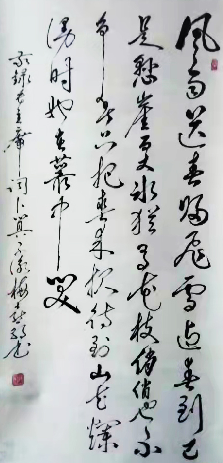 释文:天高云淡,望断南飞雁,不到長城非好汉,屈指行程两万。六盘山上高峰,红旂漫捲西风,今日長缨在手,何时缚住蒼龙。