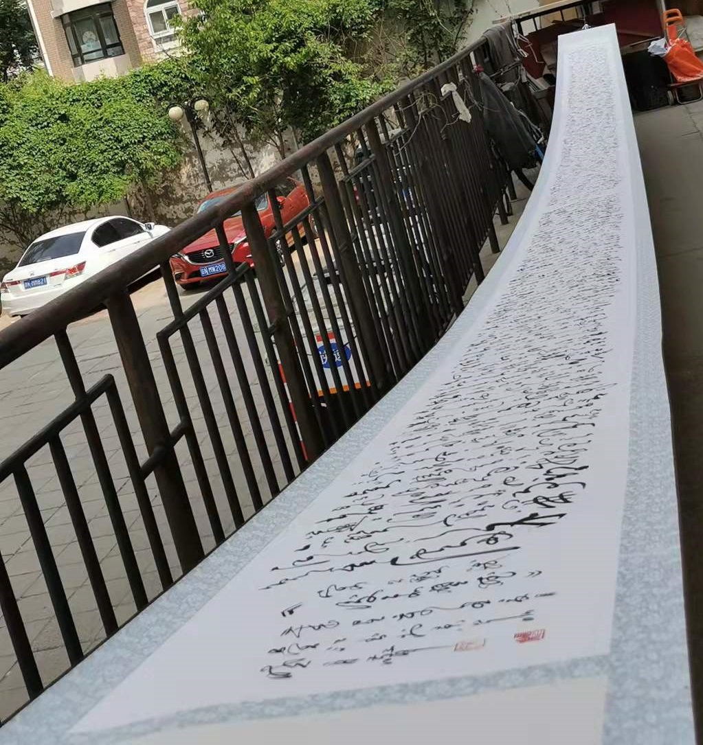 吴江先生的草书创作,除了有习成古法,极有法度的规矩。也有放手写心,恣意抒情的个性。有法度,可以让草书作品避免笔墨不入格,神仙不认得的尴尬情景。笔有源,字有本,正本清源写的是传统草书的龙脉奇观。专业属性相当精彩,没有一字有弊病,可谓是无可挑剔。放手写心贵抒情,守正创新,让他的草书可以把心迹化成笔迹,让书法因循情绪节奏写得变化万千,生动有趣。不安排,不造作,以心作书不求为佳反为最佳。因为心绪感情可以主导草书的创作,所以他的草书可以写得波澜壮阔,纵横开阖写下数十米长卷《如梦令》。这种大制作的狂草作品,除了要有扎实的笔力支撑,还需要激情不绝的情感加持。如果在创作的过程中稍有差池,定然不能前后连贯,一气呵成。看到吴江先生挥笔写长卷的无量艺术功夫,必然可以体察他痴心翰墨,游到海边天作岸,登上山巅人为峰的浑然气概。