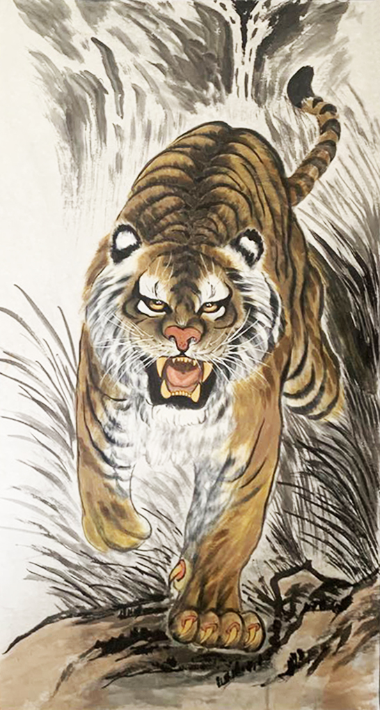 对“虎”的研究可谓是到了极致。在他笔下的“百兽之王”,威风凛凛,或长啸山林展霸王之态,或纵身山石尽显矫健身姿,万千形态,极尽风姿。仿佛一只猛虎来源于虚空之中,在二次元的世界里咆哮挣扎。要撕裂开那一幅困住它的薄弱画纸,冲进三维空间里面,向来犯者,挑衅示威。