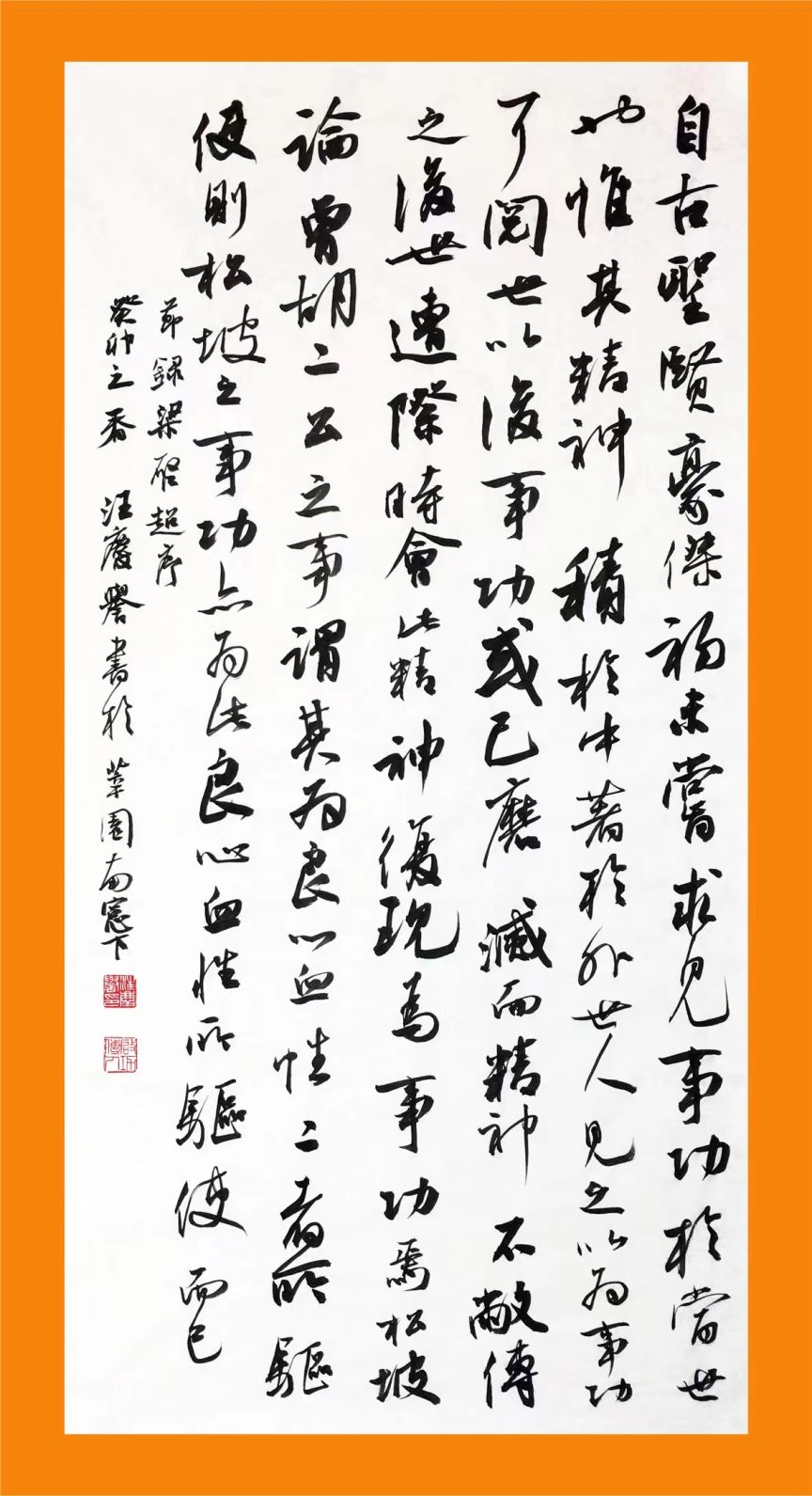 唐代虞世南曾在《笔髓论》一书中有言,是谓欲书之时,当收视反听,绝虑凝神,心正气和,则契于妙,心神不正,书则欹斜;志气不和,字则颠仆。以此纵观汪庆誉先生之作,其书亦是有深谙于此道,通幅笔墨,皆是有文人心绪之蕴藉,故而书写可见正大,落墨可彰典雅,又因对章草书风的独特参悟,整体行笔线条即更是偏向于一种简洁洗练的表现状态,时而笔短意长,不媚恣肆,时而变化有度,不尚牵连,而如此所书字势,不管是从整体作品上来看,还是从单字结构中来看,其都是恰当适宜,绝不故作多余!