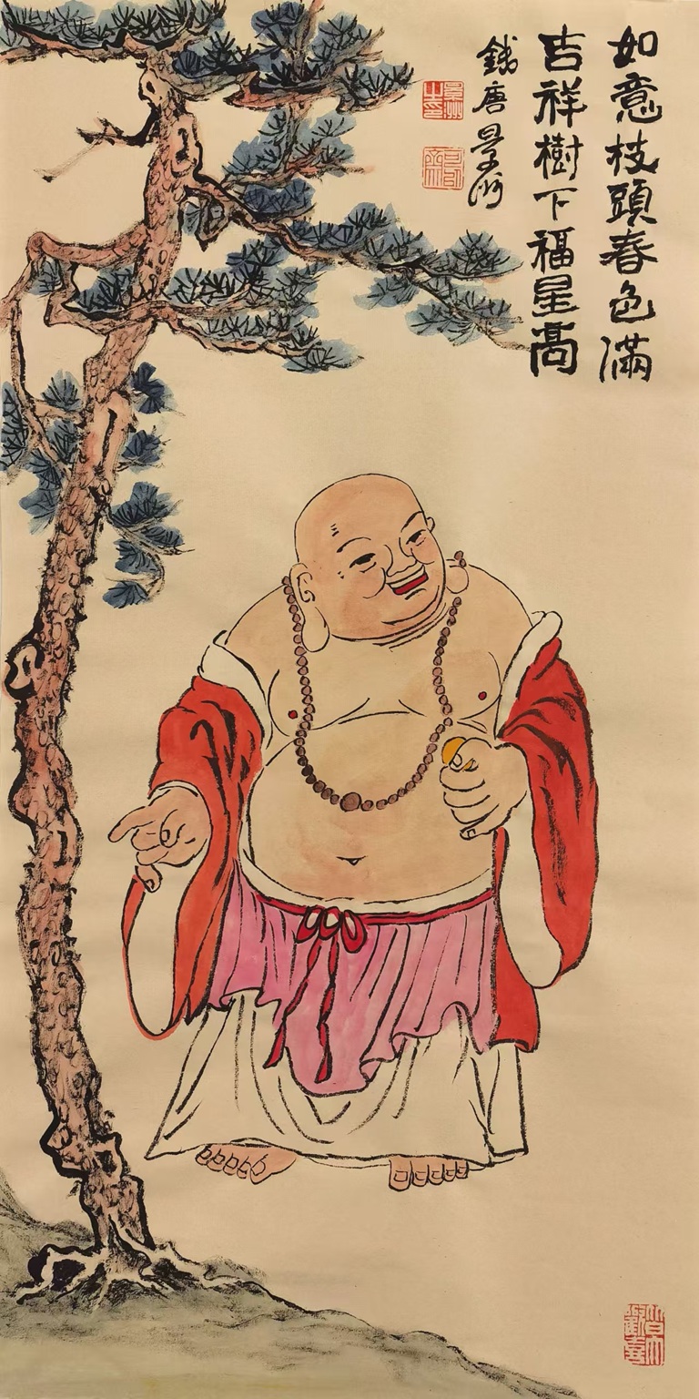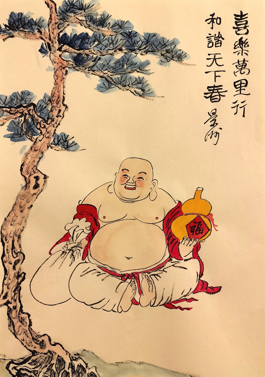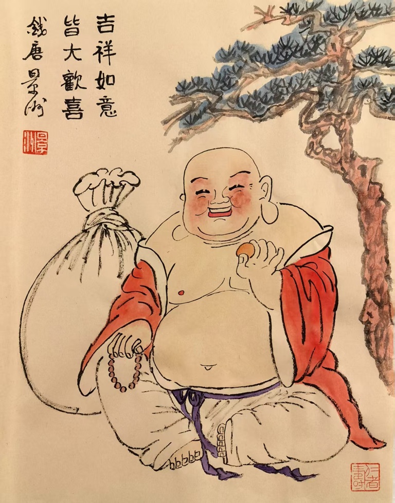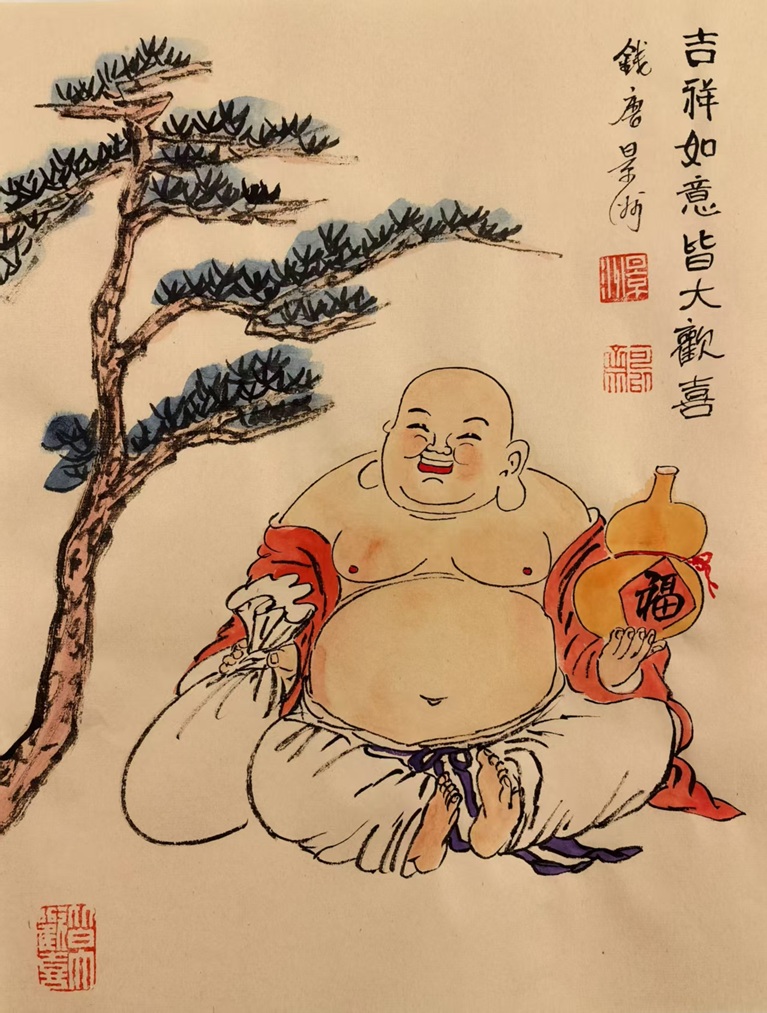 师承著名人物画家方増先、吴山明、丁茂鲁,深受其艺术熏陶,逐渐形成了自己独特的艺术风格。他的作品线条老辣,笔墨灵动,弥勒佛形象栩栩如生,深入研习明清以来写意人物画的精髓,尤以徐渭、八大山人等大师为宗,逐渐形成“笔墨灵动、形神兼备”的个人风格,呈现出一种全新的佛教文化,既有传统写意画的韵味,又融入了现代审美元素。